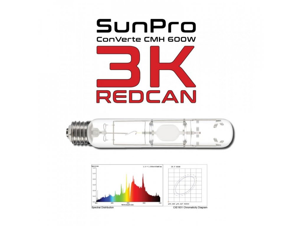 Sunpro ConVerte CMH 600W 3K RedCan - je výbojka první svého druhu, která funguje s jakýmkoli předřadníkem o výkonu 600W a má závit E40, takže ji lze použít s většinou reflektorů na trhu bez potřeby speciálních adaptérů nebo jiných speciálních objímek.