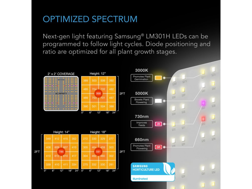 - Pěstební světlo s diodami LM301H: Silné LED osvětlení simuluje přirozené sluneční světlo a optimalizuje růst.