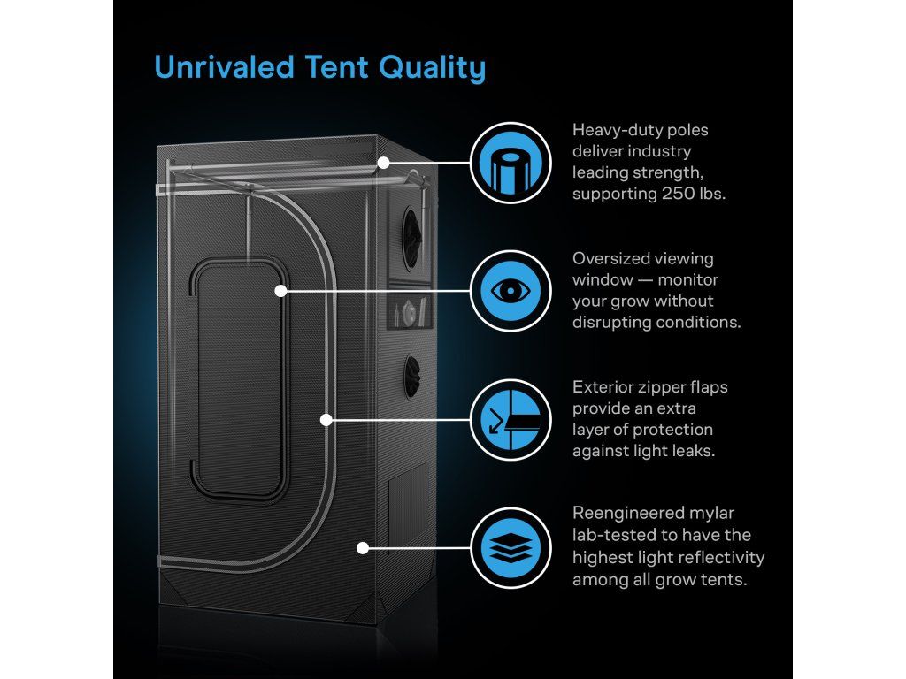 - Kompletní kit: Prémiový stan Mylar 2000D 90x90x180cm, australský uhlíkový filtr, potrubí, látkové květináče, nůžky na stříhání a další.