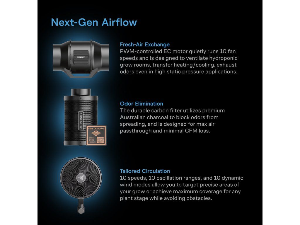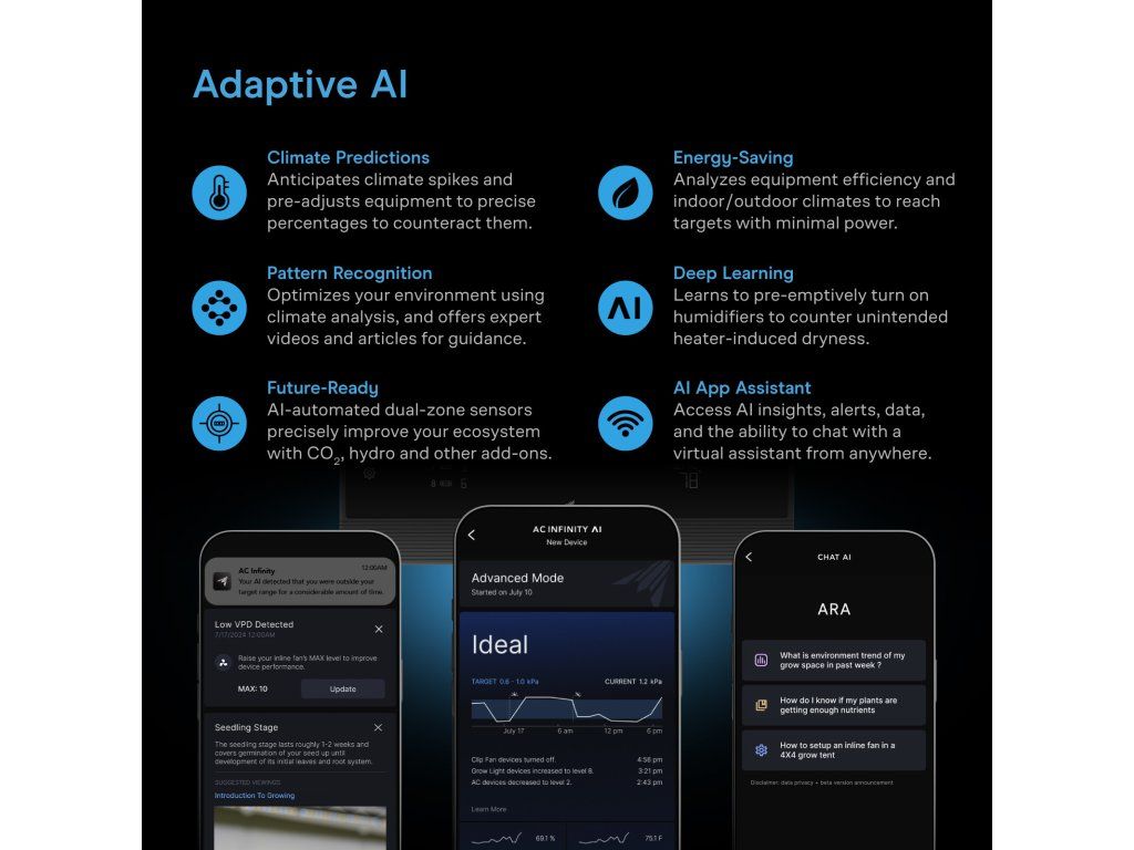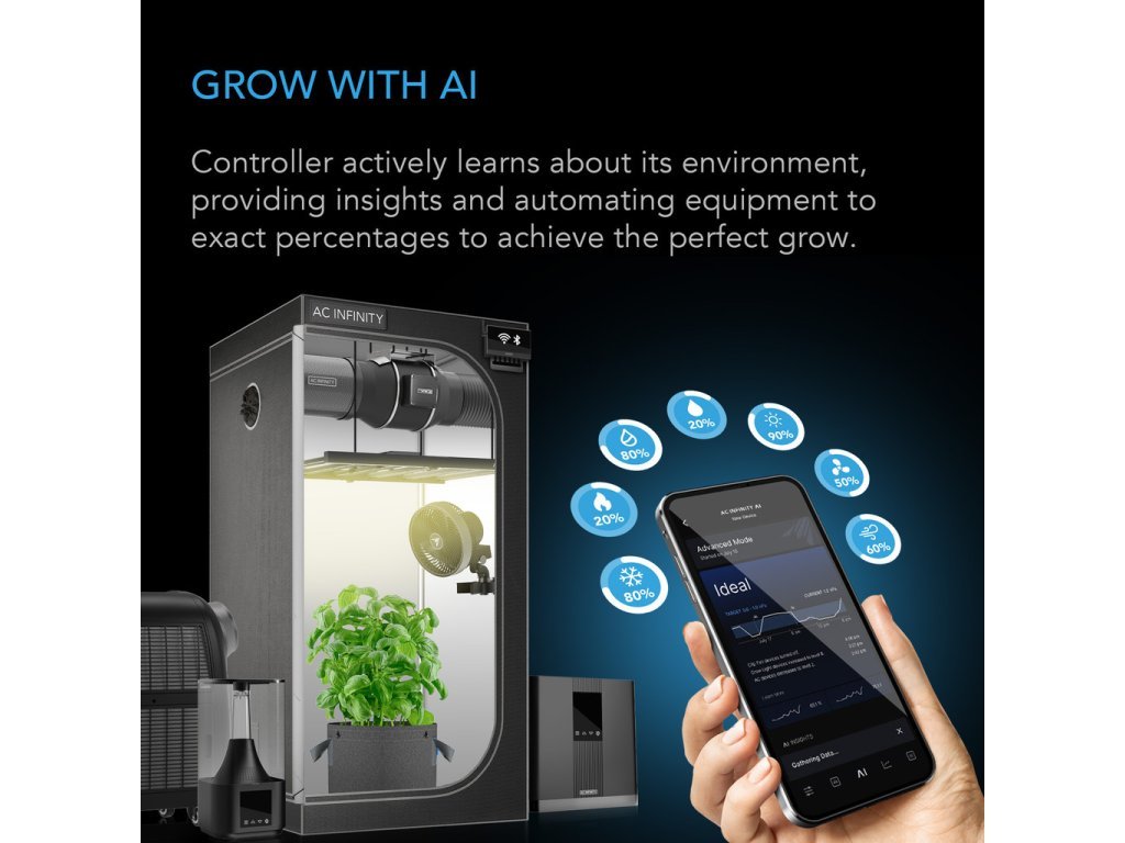 S centrálním ovladačem CONTROLLER AI+ můžete automatizovat všechna zařízení ve vašem pěstebním stanu. Můžete nastavit dynamické programy na základě VPD (deficit parního tlaku), teploty a vlhkosti, což vám umožní maximálně doladit podmínky pro růst. Navíc máte možnost připojit se k aplikaci AC Infinity přes WiFi a vzdáleně ovládat svůj systém pěstování, nastavovat programy, dostávat upozornění a sledovat historické grafy.