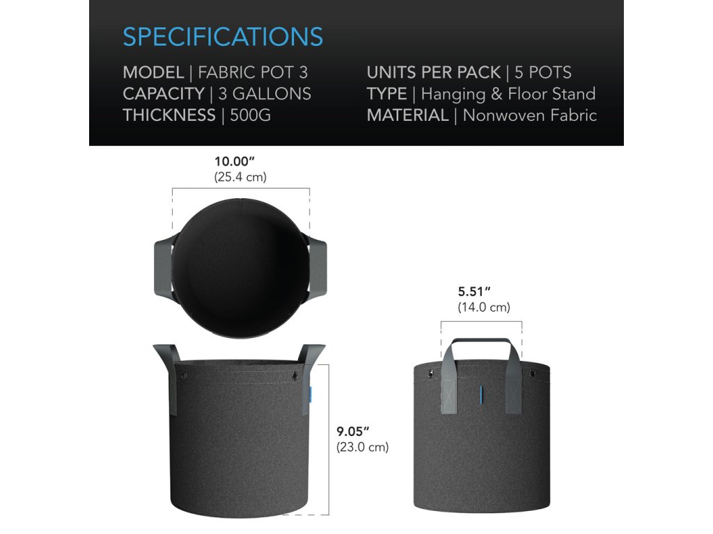 AC Infinity Heavy Duty Reusable Fabric Pots, 11 liters, 5-Pack