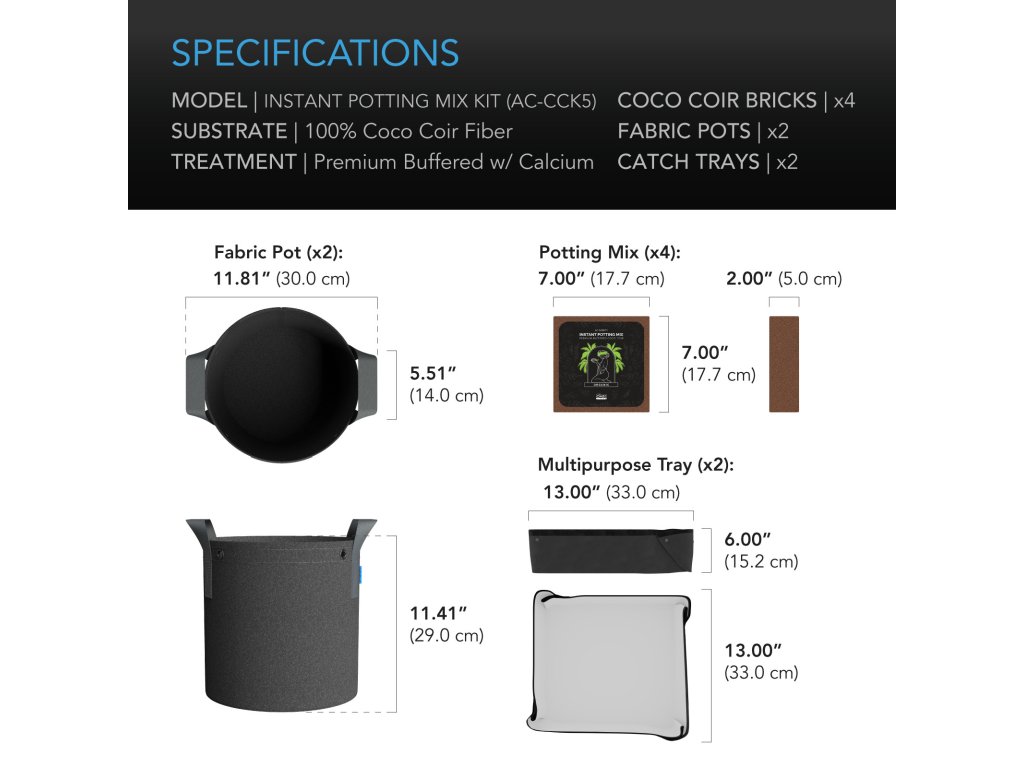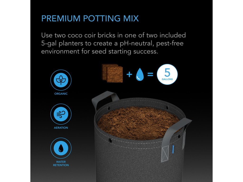 Sada pro rozmnožování rostlin, která obsahuje vše, co potřebujete k úspěšnému pěstování semen. Pomocí této sady můžete rychle vytvořit prostředí příznivé pro semena, které usnadňuje klíčení a zajišťuje úspěšné pěstování v interiéru. Tato sada obsahuje čtyři bloky prémiového kokosového substrátu, který je 100% organický, dva 19litrové látkové květináče a dvě vodotěsné odkapávací misky. Stačí přidat vodu do kokosového substrátu a počkat až 30 minut, abyste získali pH neutrální náhradu půdy, která pomáhá zdravému vývoji kořenů. Tento substrát lze umístit do přiloženého 19litrového látkového květináče, který je navržen tak, aby zlepšoval kořenovou síť tím, že provzdušňuje kořenové špičky a odvádí přebytečnou vodu. Látkový květináč umístěte do víceúčelové misky, kterou lze použít jako zvlhčovací komoru k roztažení kokosového substrátu a zároveň udržet pěstební plochu uklizenou.