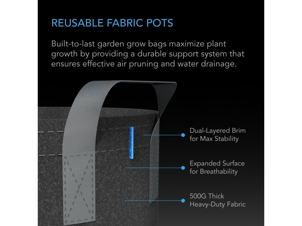 - Obsahuje dva opakovaně použitelné 5galonové látkové květináče, které zlepšují růst rostlin odvodněním přebytečné vody a prořezáváním kořenů vzduchem.