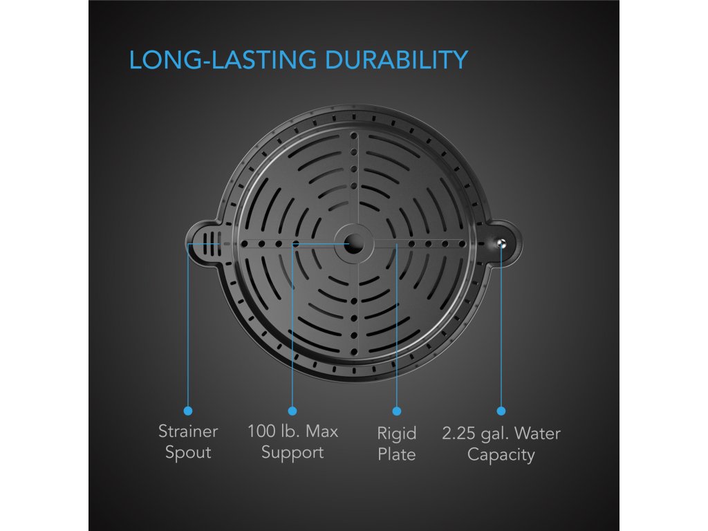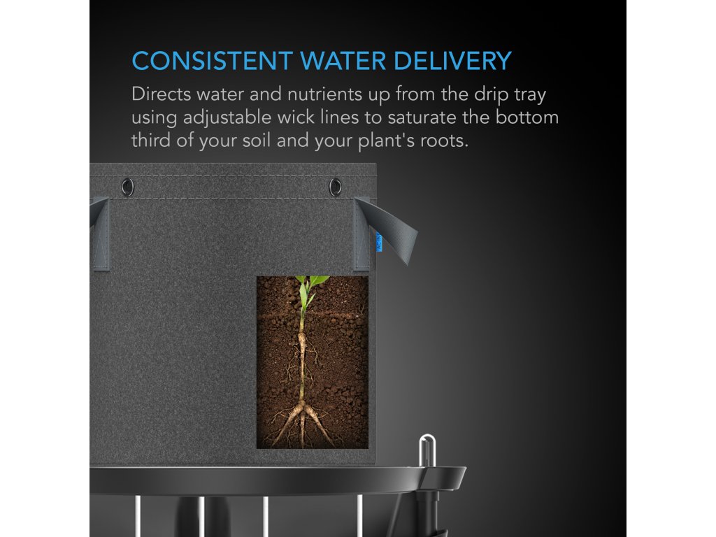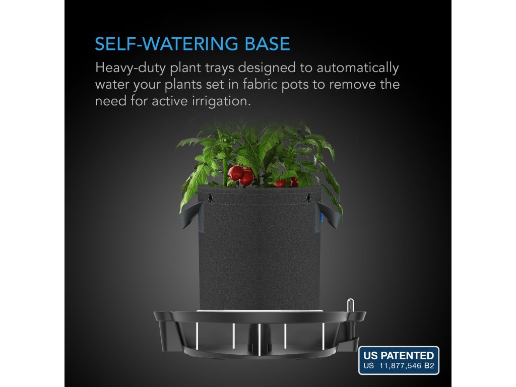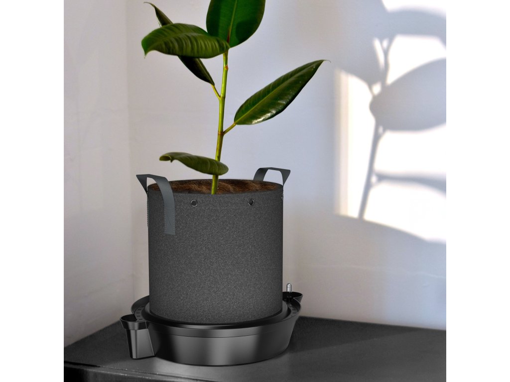 Sada velkokapacitních spodních zásobníků navržených tak, aby automaticky zavlažovaly rostliny a eliminovaly potřebu každodenního zavlažování. Patentované samozavlažovací látkové dno květináče (US Patent #11877546) dodává vodu až do látkového květináče pomocí vysoce absorpčních knotů, které zvlhčují půdu a kořeny. Její odolný podstavec uchovává stékající vodu a živiny pro pozdější použití. Při použití se zásobníkovou deskou vydrží tento podstavec až 100 kg. Tato deska také zvedá látkový květináč nad zem, aby se v něm nešířily řasy a jiné nežádoucí nánosy. Součástí balení je vodoznak, který zobrazuje aktuální hladinu vody v nádrži, zatímco výtok sítka na druhém konci umožňuje rychlé vylévání a doplňování vody.