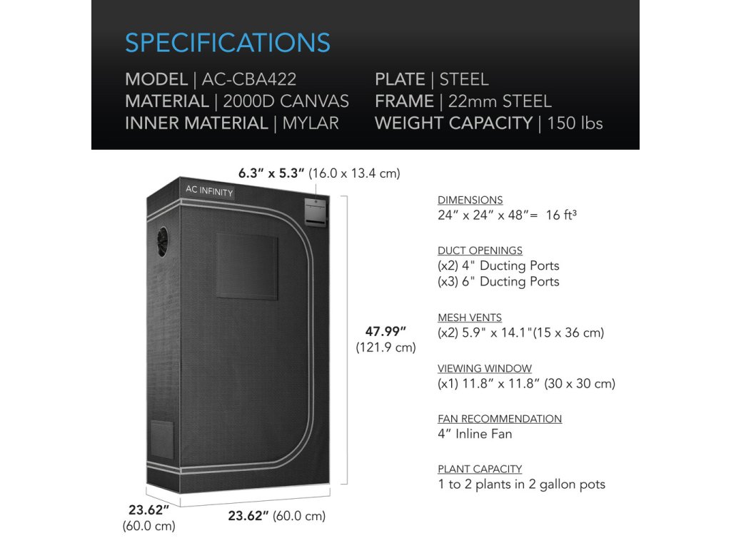AC Infinity CLOUDLAB 422, Advance Grow Tent, 2000D Diamond Mylar Canvas, 60x60x120cm