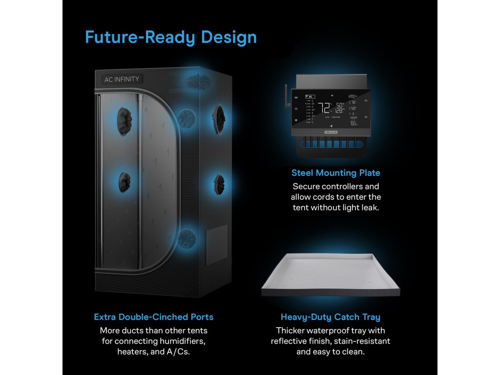 Uspořádejte své pěstitelské příslušenství uvnitř nebo vně stanu pomocí praktické odnímatelné tašky na nářadí. Další stažitelné průduchy umožňují snadnou instalaci zvlhčovačů, topidel nebo klimatizací bez narušení těsnosti stanu.