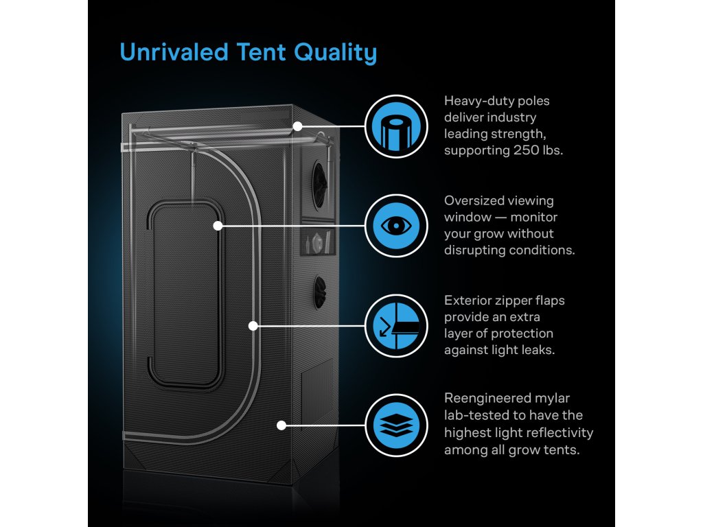 - The Ultimate Grow Tent — vytvořen kombinací špičkových materiálů a precizního řemeslného zpracování s nejnovější technologií pro indoor pěstování.
