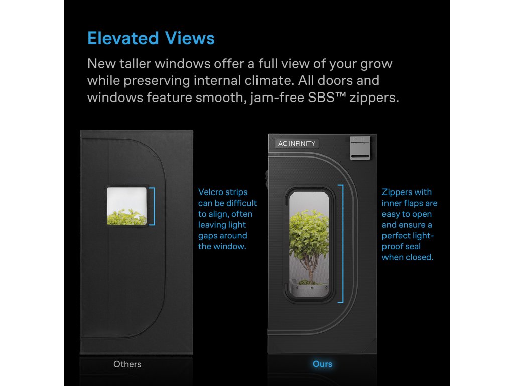 - Vyšší okna poskytují plný výhled na vaše pěstování při zachování řízení klimatu, se zipy SBS™, které umožňují snadné otevírání a zavírání.