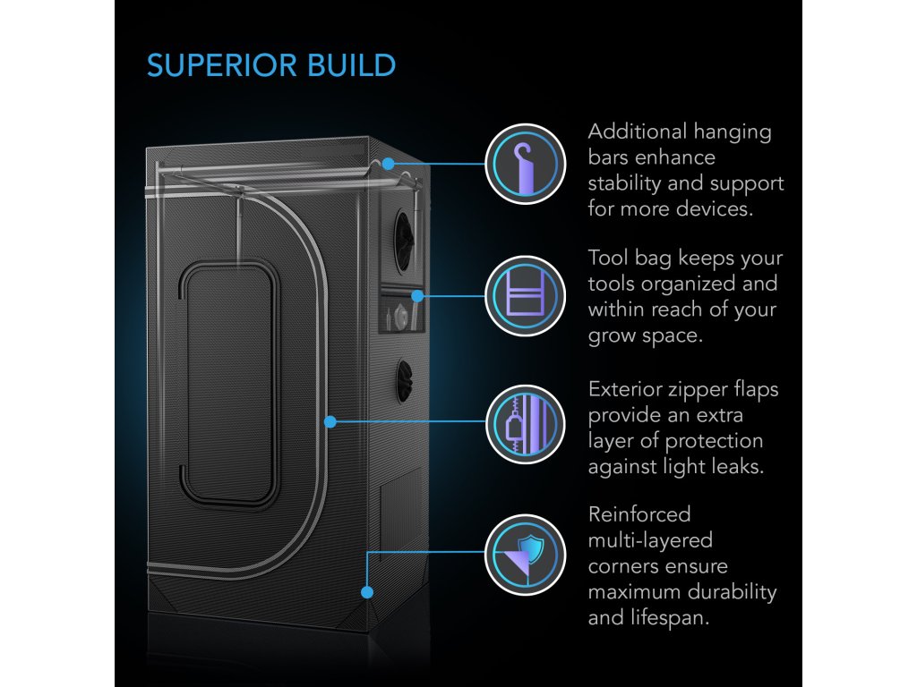 - Nejpevnější 1palcové ocelové tyče, nejtlustší plátno 2000D, přepracovaný mylar testovaný v laboratoři, který má nejvyšší odrazivost světla ze všech pěstebních stanů.