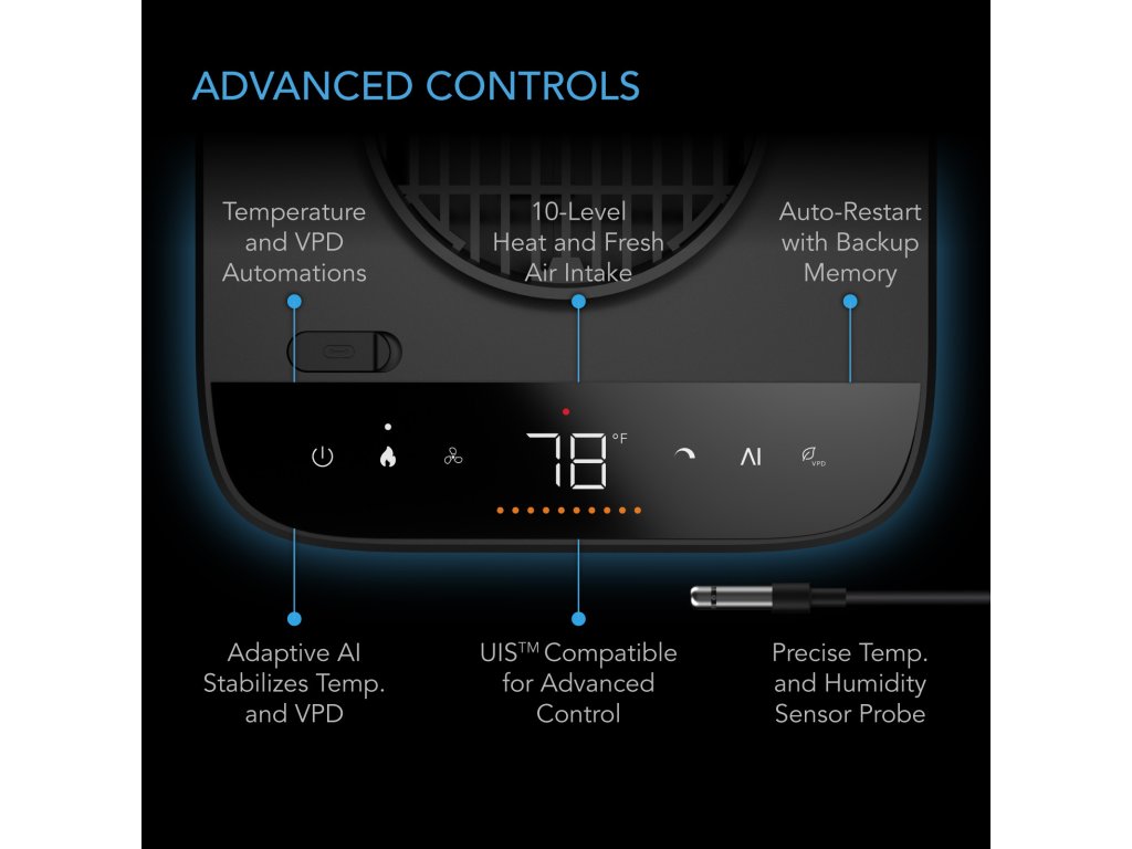 Vyzkoušejte precizně navrženou regulaci klimatu s tímto výkonným 1000W topením řízeným umělou inteligencí. Je navrženo tak, aby optimalizovalo růst v každé fázi, a automaticky upravuje teplotu, proudění vzduchu a VPD, aby udržovalo vaše cílové prostředí. Jednotlivé PTC desky s PWM ovládáním poskytují 10 skutečných úrovní tepla nebo přívod čerstvého vzduchu pro vyvážené podmínky, zatímco duální kanálové porty podporují jak otevřené, tak uzavřené nastavení pro univerzální integraci. Tento produkt je certifikován ETL a disponuje bezpečnostními funkcemi, včetně alarmů při převrácení, nehořlavých materiálů a ochrany proti přehřátí s automatickým restartem, takže poskytuje výkon, na který se můžete spolehnout. Navržen výhradně pro vnitřní použití. Používejte pouze v kontrolovaných prostředích s vlhkostí mezi 30 % a 65 % RH, včetně přiváděného proudu vzduchu. Nepoužívejte venku ani v oblastech s vysokou vlhkostí. Nepoužívejte s zvlhčovači vzduchu v uzavřených okruzích. Může dojít k vniknutí mlhy do sacího potrubí a poškození ohřívače. Ohřívače zapojujte pouze do uzemněné zásuvky s přepěťovou ochranou. Nikdy nepoužívejte prodlužovací kabely nebo prodlužovací kabely, protože by mohlo dojít k přehřátí nebo roztavení. Nepoužívejte zásuvku společně s jinými zařízeními.