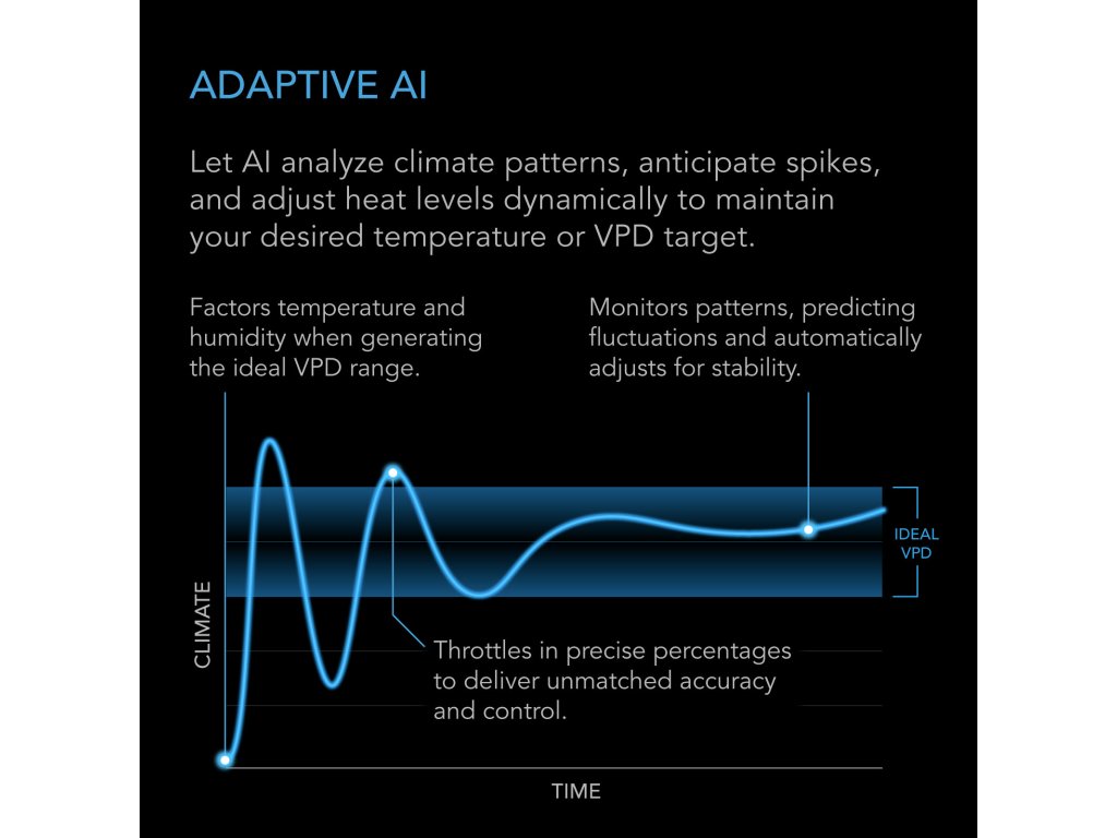 - Programování teploty a VPD poháněné adaptivní AI, která dynamicky upravuje výstup pro udržení cílového prostředí.