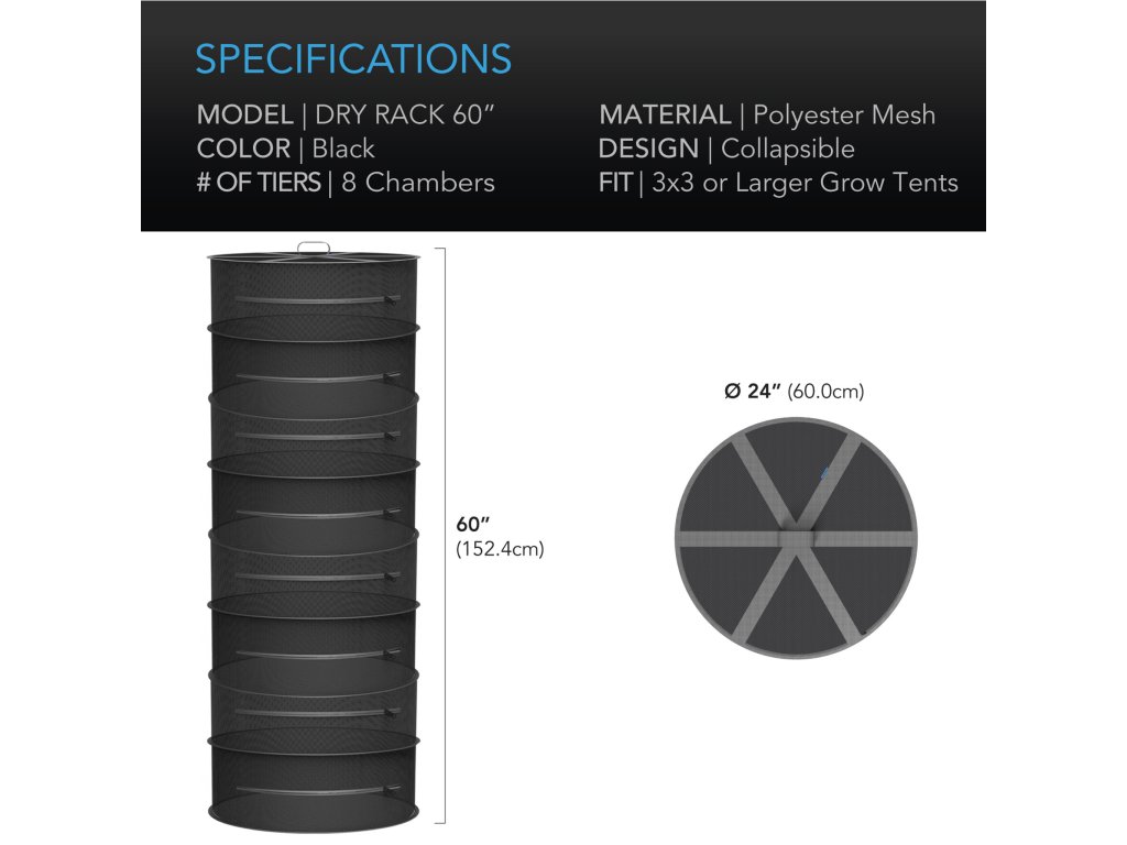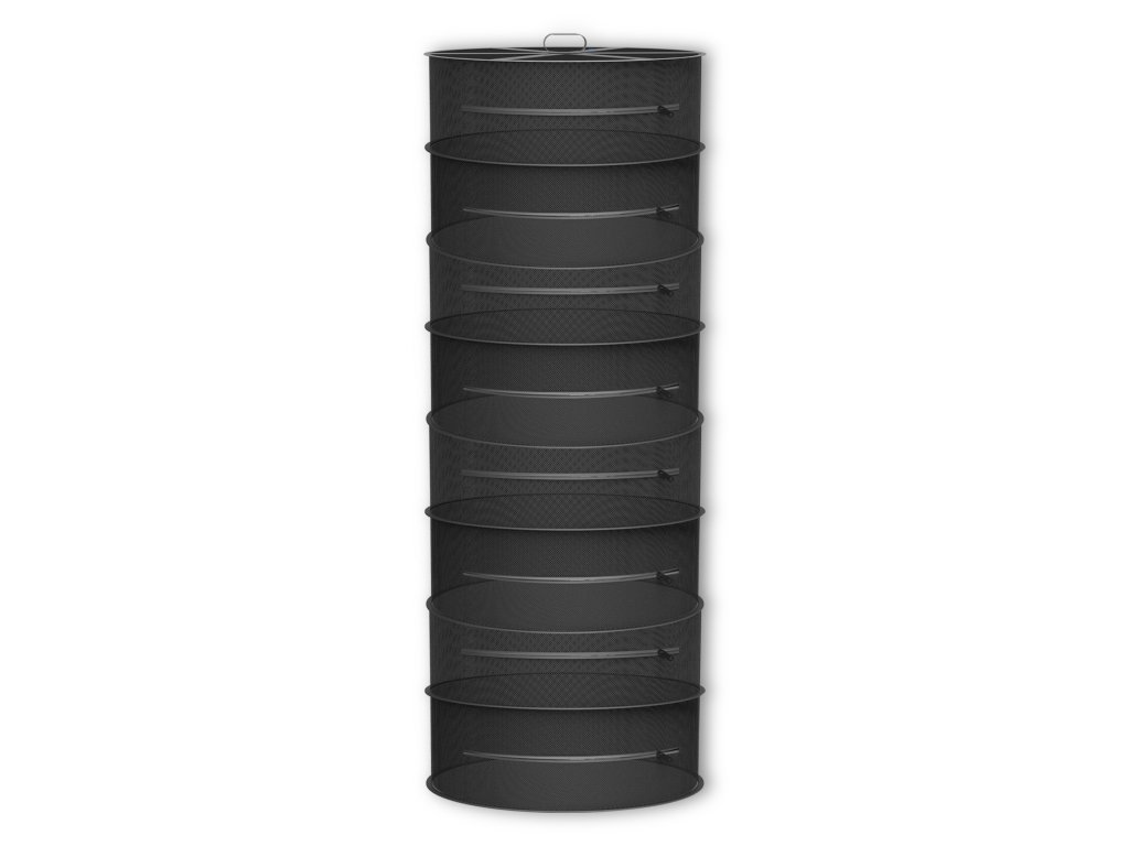 Tento stojan na sušení a zrání je vyroben tak, aby se vešel do malých prostor, jako jsou pěstební stany a skříně, ale lze jej zavěsit i ve venkovním prostředí nebo v jiných otevřených prostorách. Síťový sušící stojan je sice schopen sušit oblečení a ryby, ale primárně se používá k sušení a sušení rostlinného materiálu, jako jsou bylinky, pupeny, ovoce, květiny, semena a zelenina.