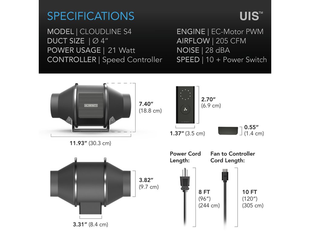 AC Infinity CLOUDLINE S4, Quiet Inline Fan System with Speed Controller, 100mm