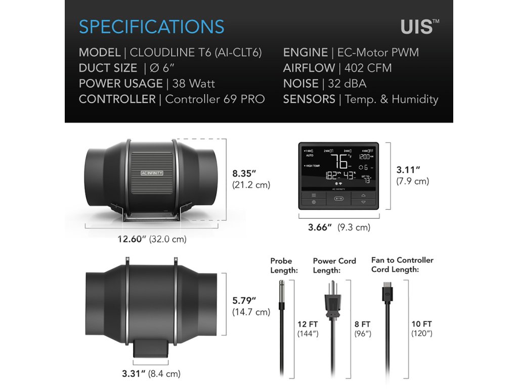 AC Infinity CLOUDLINE T6, Quiet Inline Fan System with Temperature Humidity VPD Controller, 150mm