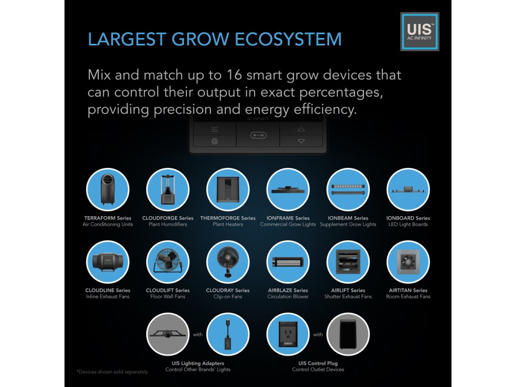 Ovladač CONTROLLER 69 PRO nabízí pokročilé programování, které zahrnuje spouštěče pro teplotu, vlhkost a VPD. Umožňuje nastavení dynamických rychlostí ventilátoru, které reagují na změny v podmínkách. Lze nastavit minimální rychlost ventilátoru, která bude běžet konstantně a zvýší se pouze při spuštění. K dispozici jsou režimy časovače, cyklu a plánu pro vlastní aktivaci podle potřeby. Ovladač se bezpečně připojuje k aplikaci AC Infinity přes WiFi a poskytuje pokročilé automatizační funkce, zobrazení historických klimatických grafů, export CSV dat a možnost vzdáleného ovládání ventilátoru. Ovladač může připojit až čtyři UIS zařízení, včetně produktů jako CLOUDLINE, CLOUDRAY a IONFRAME Series, a lze jej propojit s dalšími zařízeními mimo UIS platformu pomocí vybraných adaptérů.