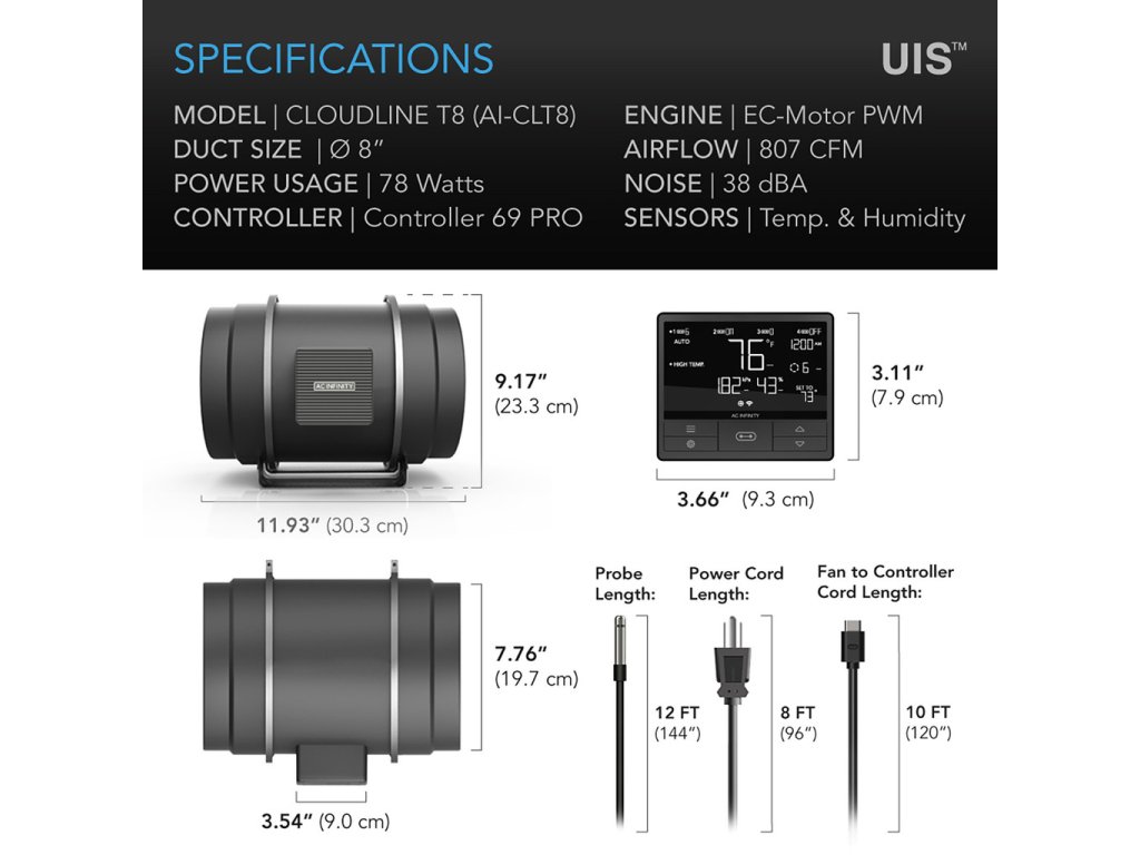 AC Infinity CLOUDLINE T8, Quiet Inline Fan System with Temperature Humidity VPD Controller, 200mm