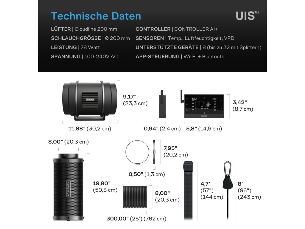 AC Infinity Air Filter Set AI+ PRO 200mm, Inline Duct Fan With AI+ Controller and Activated Charcoal Filter