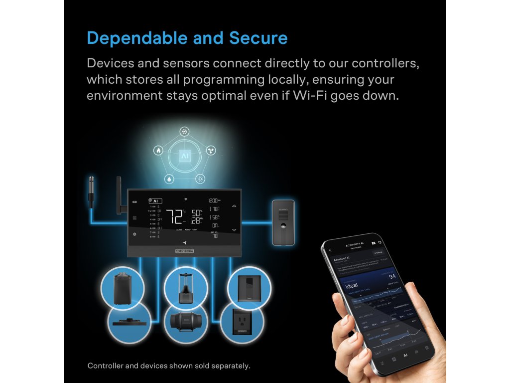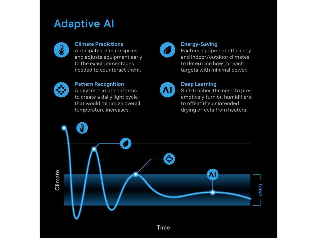 CONTROLLER AI+ monitoruje vaši pěstební plochu a spolupracuje s vestavěným ventilátorem, aby upravoval prostředí a zajišťoval stabilní klima. Jde daleko za hranice jednoduchého zapínání a vypínání nebo čistě časových programů: systém se neustále učí, analyzuje předchozí výsledky, aby nedocházelo k překračování nebo nedosahování výkonových úrovní, a ještě lépe optimalizuje vaše klima. Připojte tento regulátor k aplikaci AC Infinity a vyberte si mezi dvěma vstupy AI: rychlé, AI generované předvolby, které se nastavují automaticky, nebo jemně vyladěné ovládání pro maximální přizpůsobení. Získáte také přístup k užitečným průvodcům pěstováním, receptům, článkům, videonávodům a podpoře chatbota, které vám poskytnou znalosti pro další zlepšení vašeho pěstování.