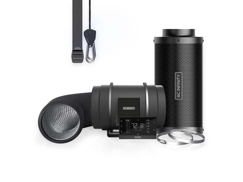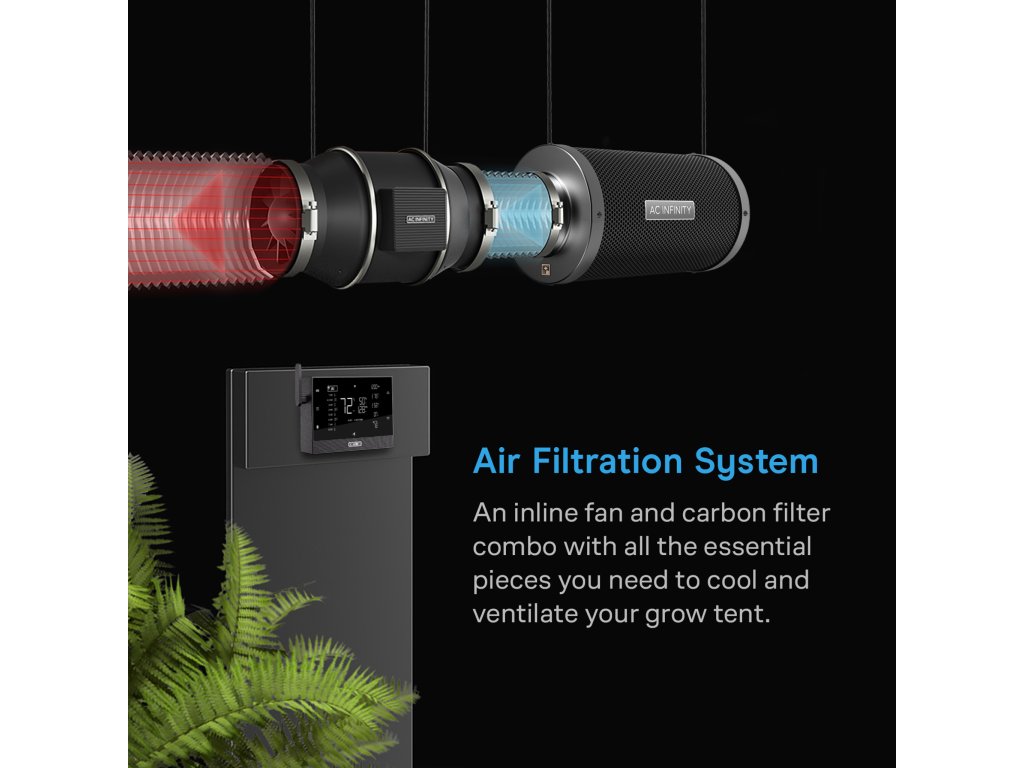 - Kompletní sada vzduchových filtrů se vším, co potřebujete k účinnému chlazení a větrání vašeho pěstebního stanu a spolehlivé kontrole pachů.