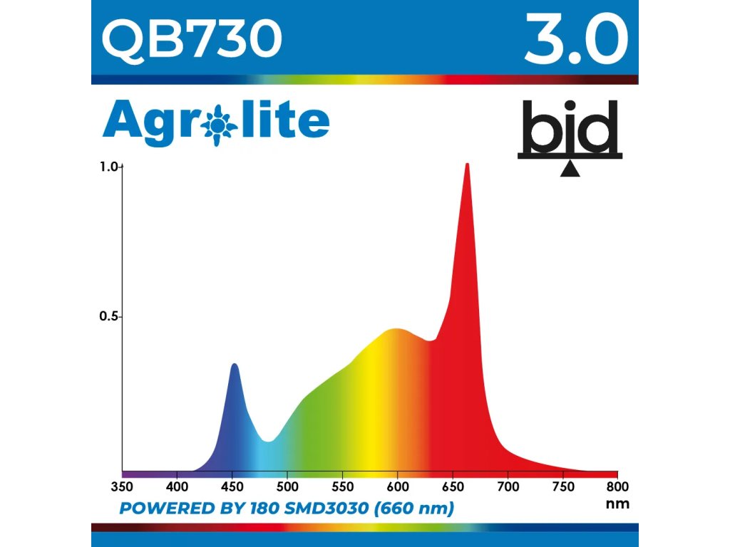 Agrolite QB730 3.0 bid je navržen tak, aby poskytoval homogenní a přesné osvětlení v pěstebních prostředích. Díky technologii Balanced Impact Distribution (dib) a spektru světla obohacenému o červenou barvu (SMD 3030red x 180 čipů) poskytuje toto zařízení rovnoměrné a efektivní pokrytí, které zvyšuje výkon rostlin.