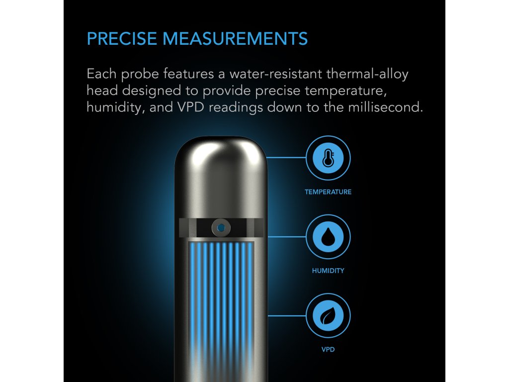 Inteligentní senzorová sonda určená pro Controller AI+, která zjišťuje teplotní a vlhkostní podmínky a vypočítává hodnoty VPD. Klimatický snímač využívá hlavu z tepelné slitiny švýcarské výroby a ocel typu 316 SAE, která se dokáže přizpůsobit rychle se měnícím klimatickým podmínkám. Díky tomu poskytuje přesné údaje o teplotě a vlhkosti a umožňuje rychlé přizpůsobení chytrých zařízení potřebám prostředí. Šňůrová sonda je vybavena voděodolným těsněním, které blokuje stříkající vodu a prach, takže váš regulátor odolá vlhkým podmínkám s krytím IP-44. Její délka je 24 stop pro aplikace s bodovým pokrytím detekce, jako jsou pěstební stany, vzduchotechnické potrubí, kůlny na nářadí a skříně s AV komponenty.
