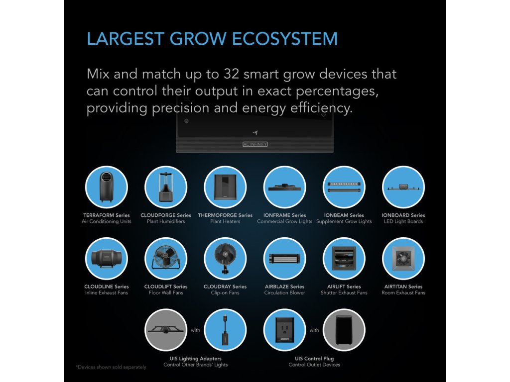 - Kompatibilita s 32 zařízeními: Podporuje zařízení UIS™ a další zařízení jiných značek jako jsou ventilátory, pěstební světla, zvlhčovače a topení.