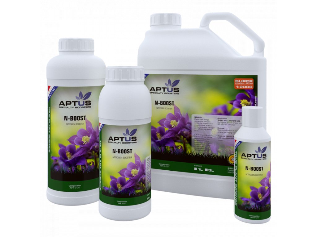 APTUS N-Boost je organický stimulátor růstu. Obsahuje organický dusík a L-aminokyseliny podporující zdravý proces růstu, zlepšující fotosyntézu a zvyšující obsah cukrů. L-aminokyseliny také podporují populaci prospěšných půdních bakterií.