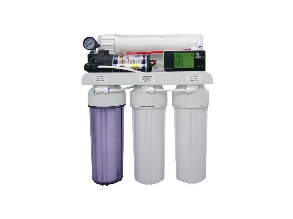 Čtyřstupňová mikroprocesorem řízená reverzní osmoza s čerpadlem a manometrem.