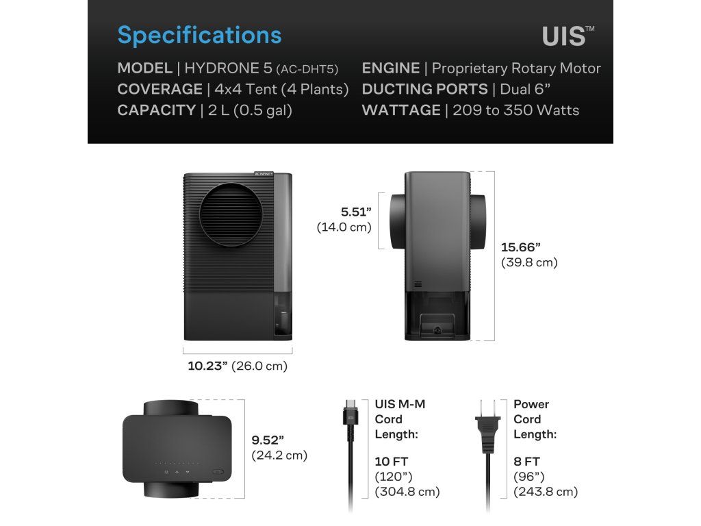 AC Infinity HYDRONE 5, Plant Dehumidifier with 10-Level Controls, Works in All Environments, High-Precision PWM Motor, Silent Operation, Versatile Dual Duct Ports, up to 150x150cm Grow Tents
