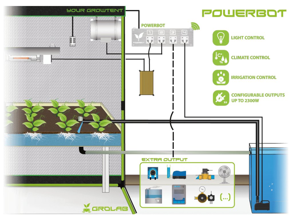 Komplexní controller slouží k pohodlnému a efektivnímu řízení nejdůležitějších (lampa, ventilátor, zavlažování) a přídavných (topení, zvlhčovač, odvlhčovač, cirkulační větrák, dávkovač CO2 apod.) zařízení pro pěstování bylinek. Regulátor má celkem 4 univerzální zásuvky, které zvládnou jednotlivý i celkový příkon externích přístrojů až do 2300W. Součástí jsou teplotní a vlhkostní senzor a USB kabel.