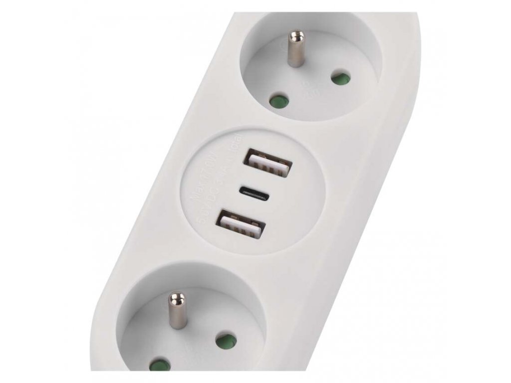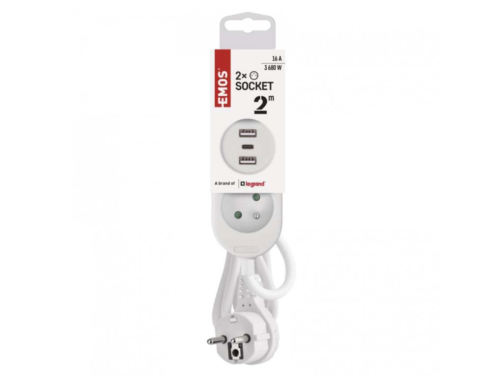 Bílý prodlužovací kabel 2m, 2 zásuvky + 2×USB A, 1×USB C