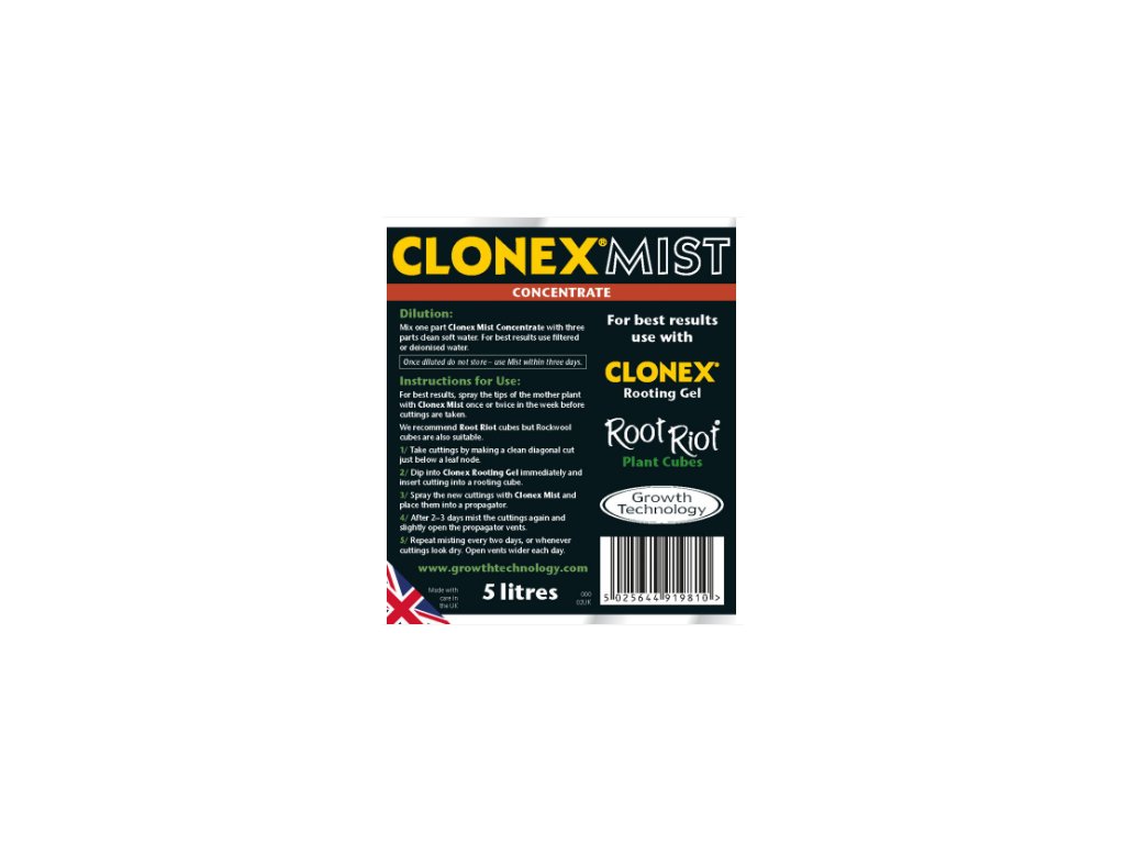 Clonex Mist Concentrate je koncentrovaný foliární stimulátor zakořeňování řízků, který se ředí v poměru 1 : 3 s měkkou vodou a používá se jako postřik na mateční rostliny i čerstvé řízky pro rychlejší tvorbu kořenů.