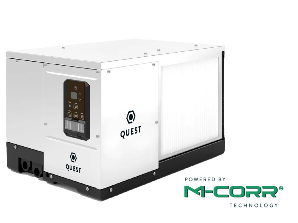 Díky patentované technologii M‑CoRR je model Quest 100 50 Hz navržen pro vysoký výkon – odstraňuje 44 litrů vlhkosti denně (při 26,7 °C/60 % relativní vlhkosti) s nejvyšší energetickou účinností v oboru a zabírá o 20 % méně místa než tradiční systémy. Je ideální volbou pro prostory s omezeným prostorem.