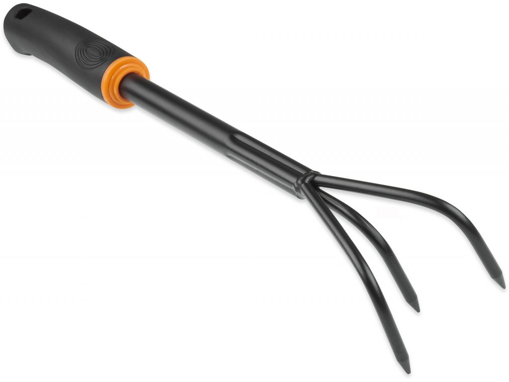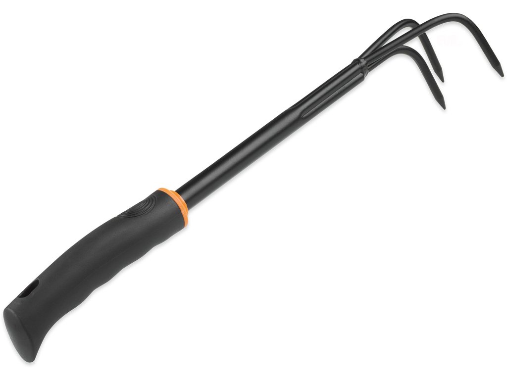 Kovový zahradní kultivátor s měkčenou rukojetí, délka 38 cm, šířka 6,5 cm.
