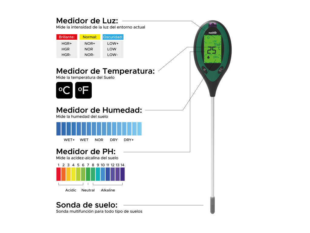 Měřič Meliflor kombinuje čtyři základní funkce v jediném kompaktním a snadno použitelném zařízení. Díky jeho pokročilé technologii budete moci měřit vlhkost půdy, úroveň pH, teplotu a množství slunečního světla, které vaše rostliny přijímají, a to vše pouhým jedním dotykem.