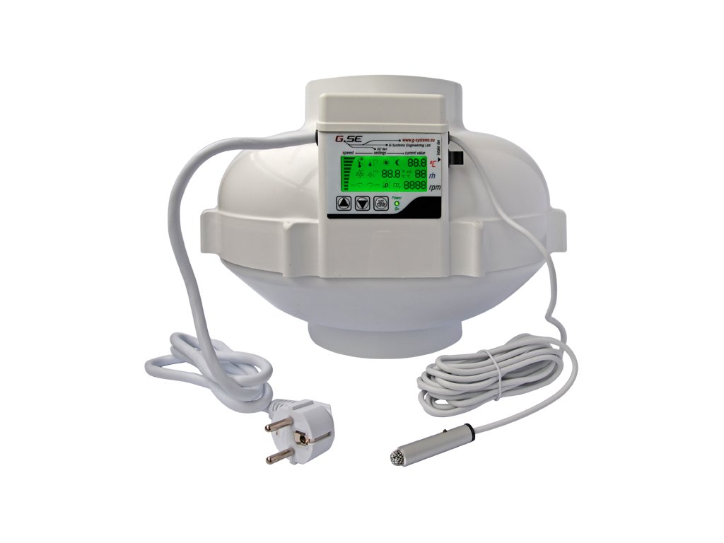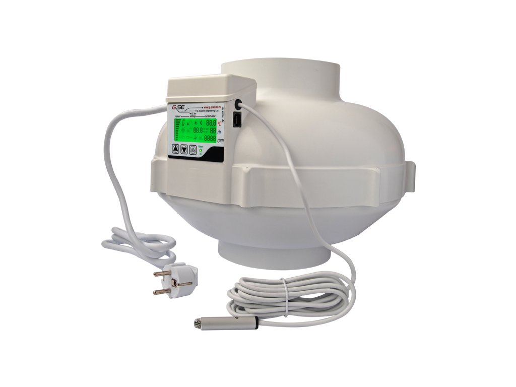 Ventilátor EC (elektronicky komutované motory) má průměr 160 mm, je to velmi výkonný ventilátor s výkonem 1'180m3/h při 0[Pa]. EC ventilátor má tu vlastnost, že při nízkých otáčkách nevydává žádný hukot a splňuje zákonem požadovanou účinnost do roku 2018. Vestavěný LCD displej s klávesnicí a LED diodou napájení umožňuje velmi snadné nastavení a čtení všech informací udávaných ventilátorem, jako jsou aktuální nastavené otáčky, teplota, vlhkost den/noc a počet otáček motoru za minutu. Samostatný sací ventilátor lze připojit k externímu portu RJ45 a provozovat jej při snížených otáčkách, aby se při regulaci vytvořil podtlak. Vestavěný světelný senzor v sondě rozpoznává denní/noční režimy. Ventilátor se dodává s 1,5m napájecím kabelem a 4m kabelem senzorů, je připraven k použití. Pomocí pouhých tří tlačítek můžete naprogramovat 15 individuálních nastavení:
