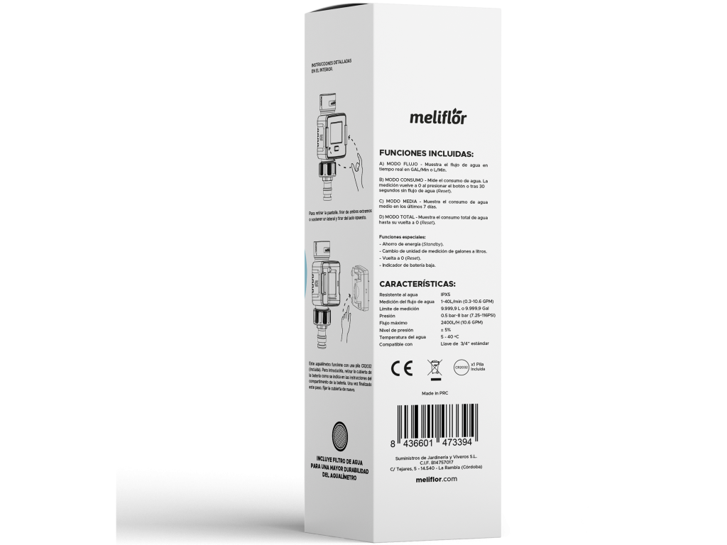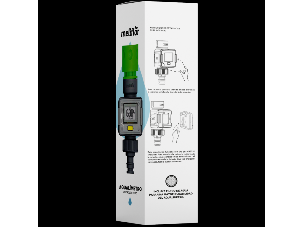 Meliflor aquametr je dodáván předem sestavený a připravený k použití. Obsahuje jednu baterii CR2032 pro napájení displeje, na kterém uvidíte zaznamenaná data.