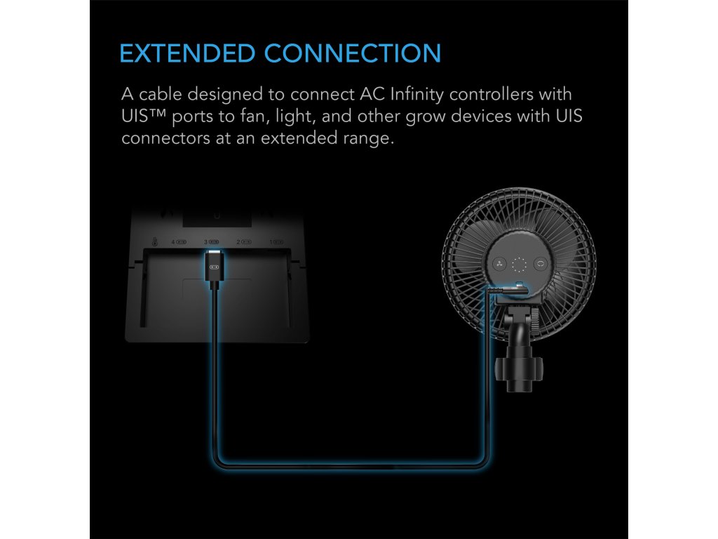 Prodlužovací kabel určený k připojení regulátorů AC Infinity k ventilátorům a světelným zařízením pro použití v pěstitelských aplikacích. Speciálně tvarovaný L-konektor pro úsporu místa. Maximalizuje užitečnost vašeho inteligentního regulátoru tím, že rozšiřuje jeho dosah na kompatibilní zařízení a poskytuje inteligentní programování, jako jsou klimatické spouštěče, časovače a plánování. Kompaktní konstrukce prodlužovacího kabelu je navržena tak, aby se vešla do konektorů a portů UIS a zajistila pevné a bezpečné připojení. Mezi kompatibilní ovladače patří Controller 69 Pro, Controller 69 Pro+ a Controller AI+ (bez ovládání funkcí exkluzivních pro zařízení).