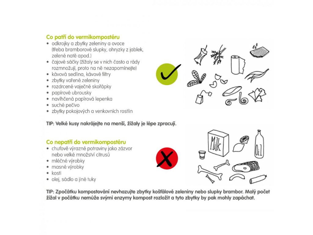 Produkt neobsahuje žížaly. V žádném případě do kompostéru nevhazujte zbytky jídla nebo biologicky nerozložitelný materiál apod.