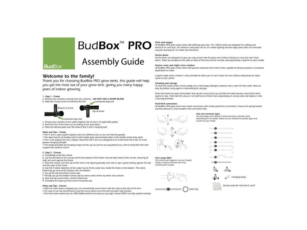 Budbox PRO XL je navržen pro osvětlení HPS a LED. Je vyroben ze 100% neprůsvitného, 4-vrstvého materiálu, který je netoxický a z kovové konstrukce s kvalitní povrchovou úpravou. BudBox stany jsou nyní vybaveny ocelovými push & click fit konektory, které poskytují kromě silnějších tvrzených ocelových sloupů větší sílu pro všechny vaše filtry, ventilátory a požadavky na osvětlení. Nový model PRO má vylepšení jako nové patentované neprůsvitné zipy, kovové spojky a spodní rám speciálně upravený pro odtok závlahy. Dále je stan bez spodních příčných trubek a má rovné dno. Jeho průchody na vzduchotechniku jsou nyní širší ( je možné použít sono potrubí). Stan je vybaven unikátním pozorovacím okénkem ze zelené folie, díky kterému můžete rostlinky pozorovat i když spí. Pro odtokovou trubici je speciálně vyvýšený spodní rám.